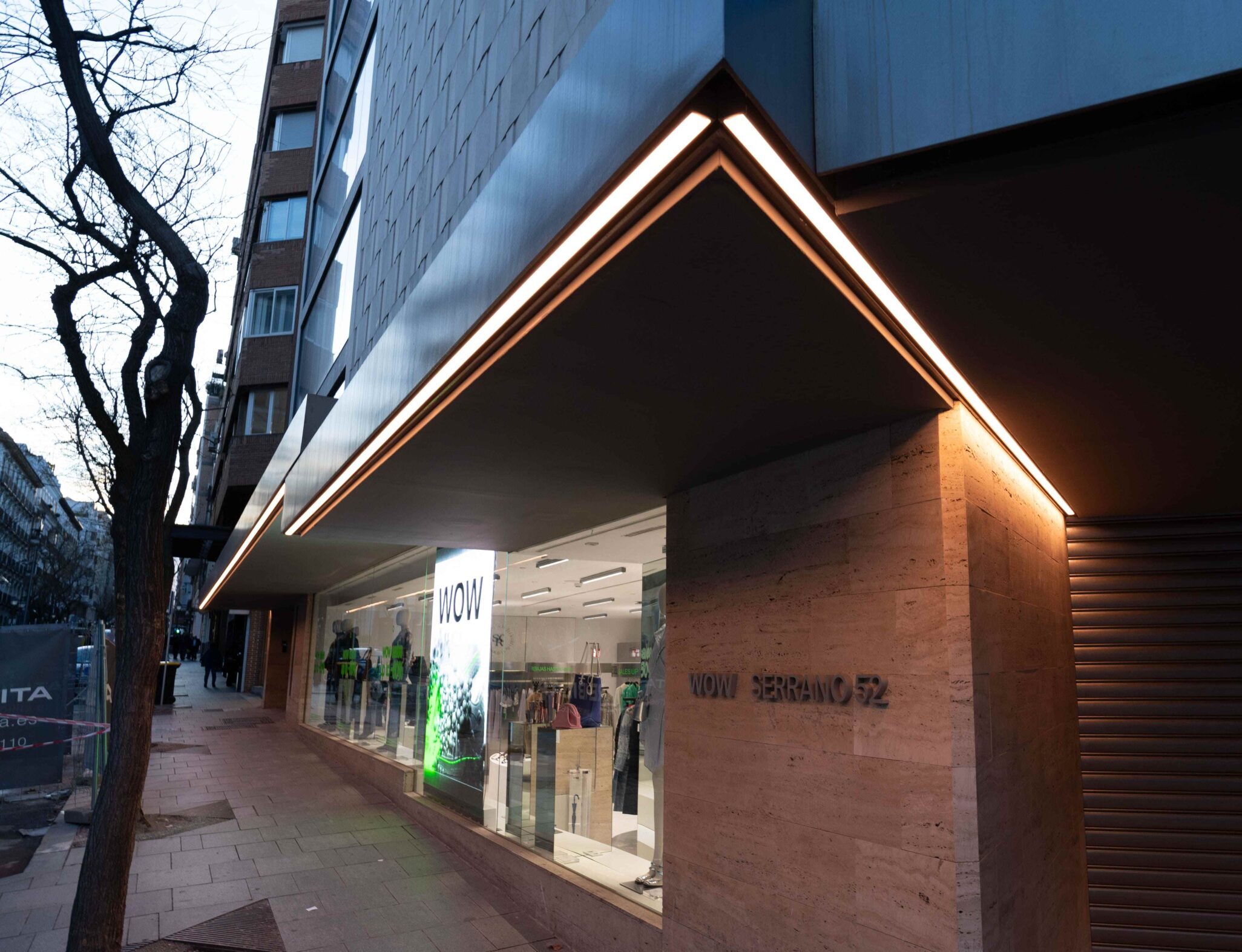 Este tipo de iluminación combina funcionalidad y estética: resalta el logotipo, los escaparates y los accesos, al mismo tiempo que transmite la personalidad de la marca. Por ejemplo: