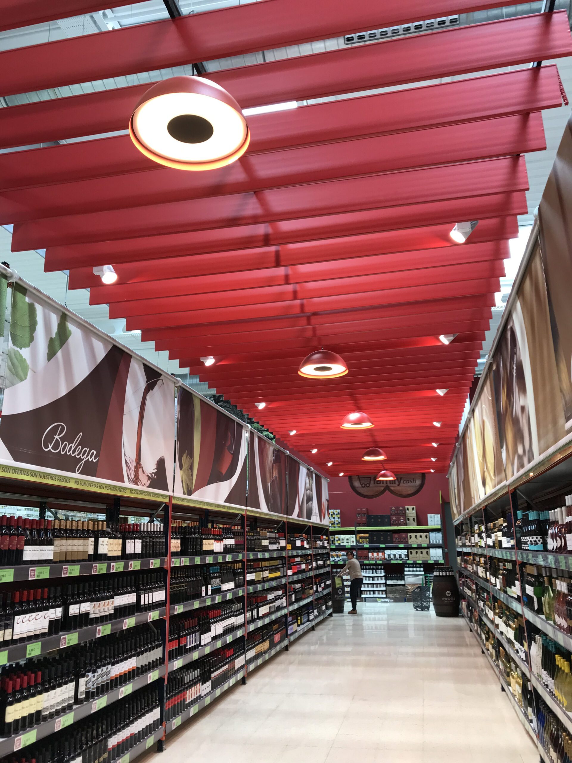 Una opción ideal si quieres aportar un toque corporativo al espacio, pues nuestras lámparas para pasillos de supermercado son personalizables, no solo en dimensión, sino en tonalidad y sobre todo en acabados. Fíjate en el resultado de la iluminación de este pasillo de Supermercado de Family Cash.