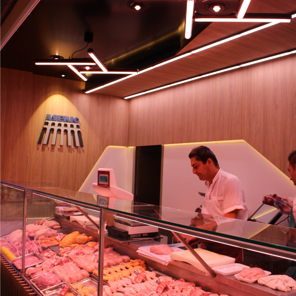 Dentro de este establecimiento ubicado en el mercado de las Águilas, hemos iluminado el espacio con luminarias Luzco a medida, gracias a nuestro Sistema Cosmos, utilizando tonalidades específicas adecuadas a este tipo de locales para resaltar al máximo el género que se ofrece. Se utilizan diferentes ópticas para distintos objetivos y productos haciendo de un mayor atractivo las paredes y punto de venta con respecto al resto del espacio. ¿Te gusta este tipo de iluminación para pollerías?