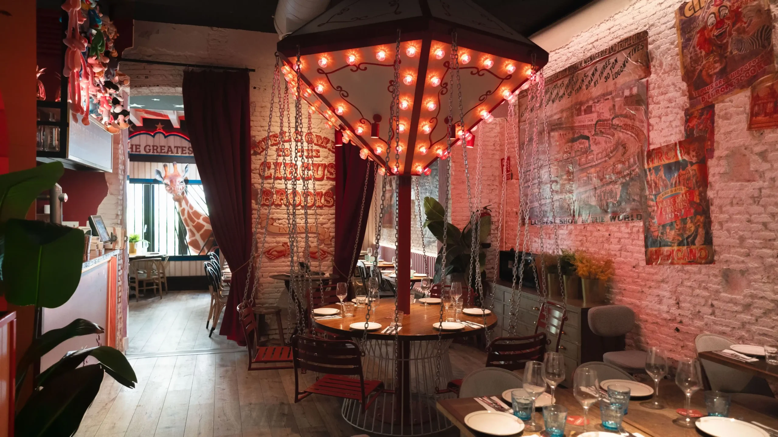 Mesas con lámparas para restaurante colgantes que generen círculos íntimos.